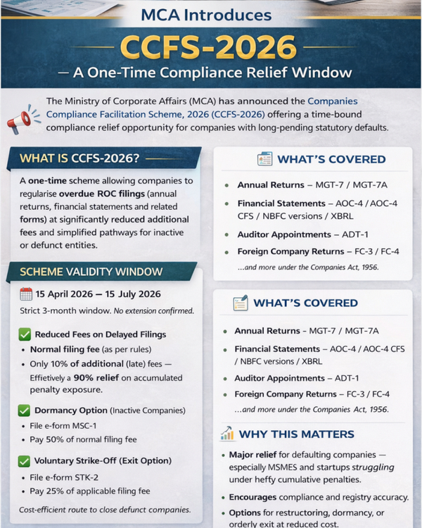 The Companies Compliance Facilitation Scheme, 2026 (CCFS-2026) provides an opportunity for companies to regularize certain long-pending statutory filings. The scheme is proposed to operate for a three month window from 15th April, 2026 to 15th July, 2026, during which eligible companies may complete specified filings by paying the normal filing fee together with only 10% of the applicable additional fees, thereby offering substantial relief from the cumulative additional fee that would otherwise arise on delayed filings.